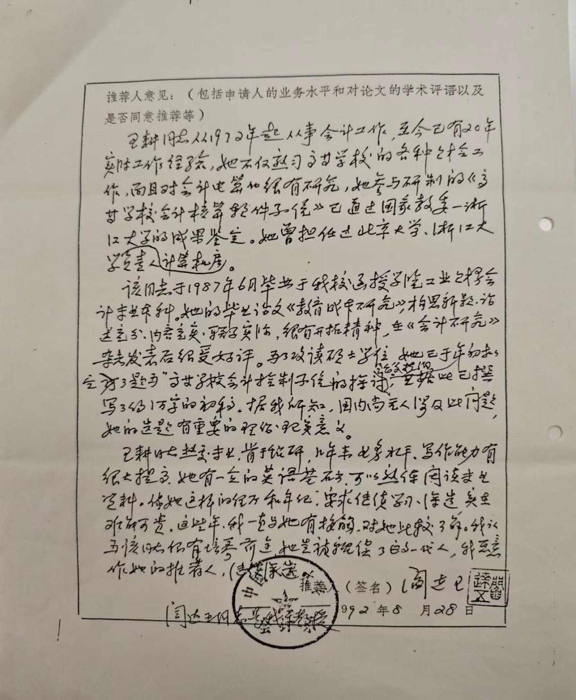 1992年8 月28日,恩师阎达五教授正式向中国人民大学研究生院推荐。