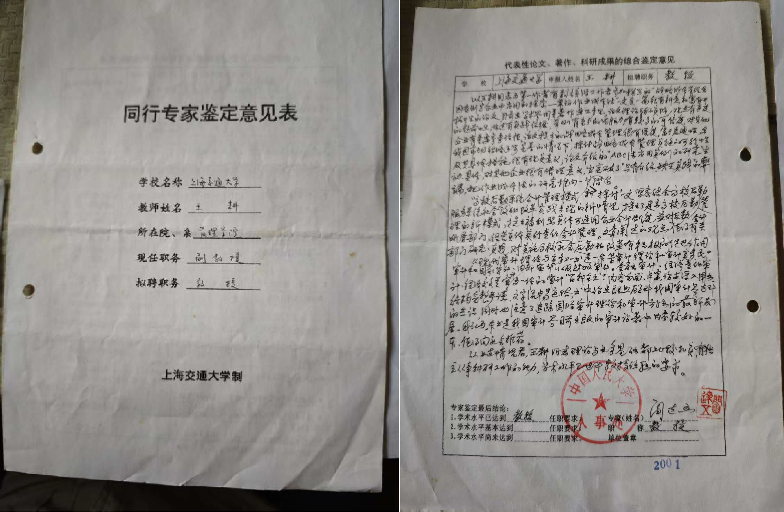 之后我申请交大教授职称评审时,《同行专家鉴定意见表》中有一份是阎达五教授发表的综合鉴定意见
