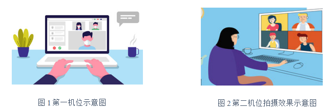 入营学生需要准备可以支撑“双机位”运行的硬件,即需要两部带摄像头的设备及附件,包括笔记本电脑、手机、手机支架等。一台设备(第一机位)从正面拍摄,放置在距离本人40cm处,另一台设备(第二机位)从入营学生侧后方45°距离本人右肩头40cm处拍摄,确保第一机位须可看到入营学生本人手部、头肩部及桌面,第二机位须可看到入营学生第一机位屏幕、入营学生面前桌面及手部动作。效果图如下: