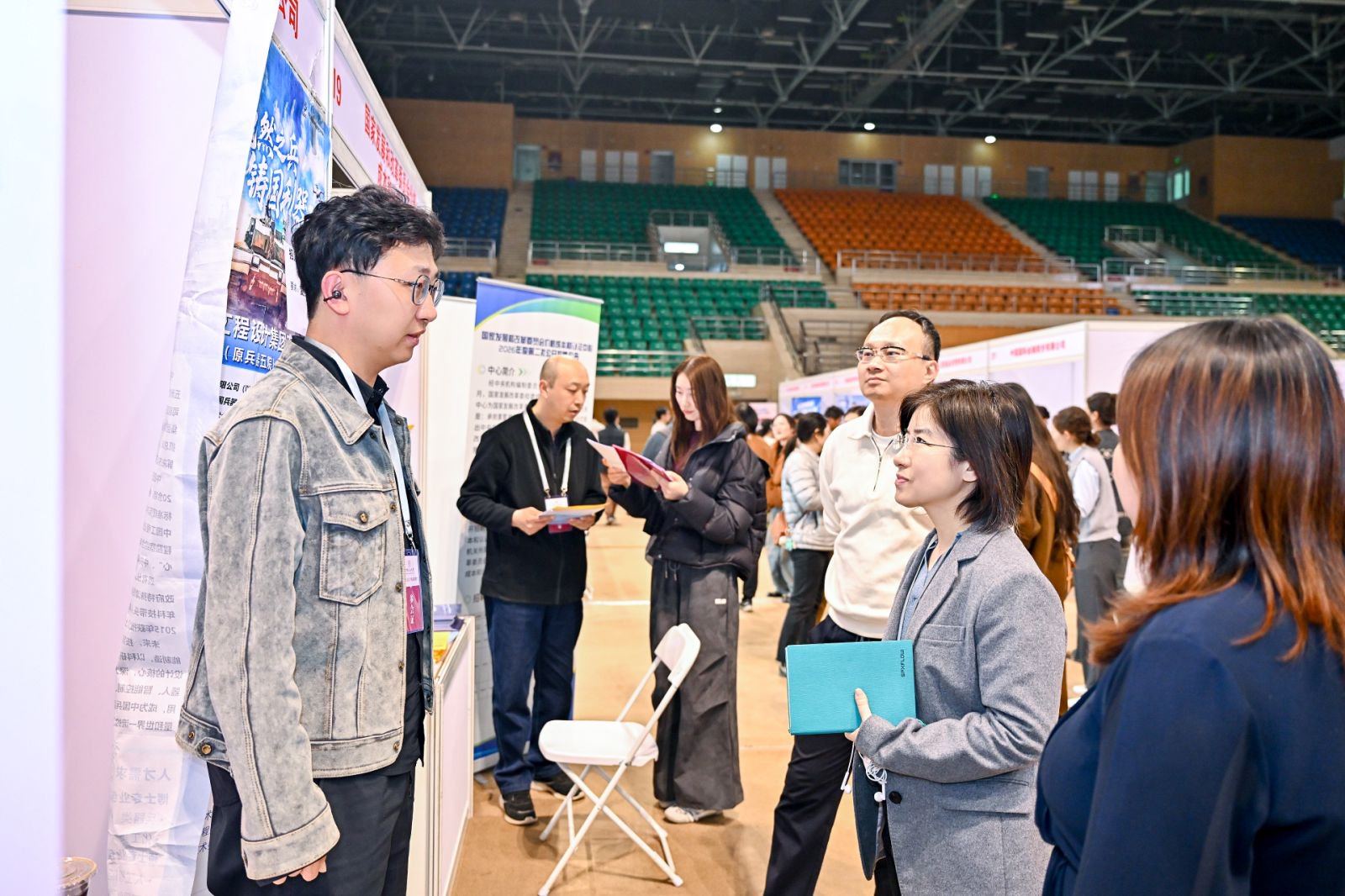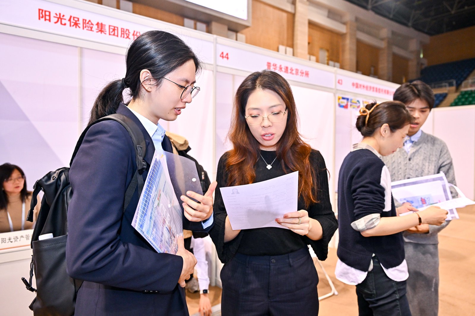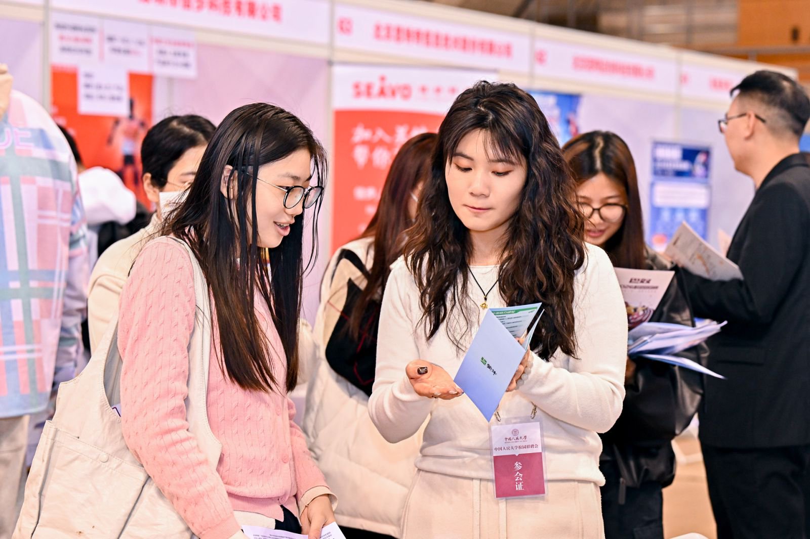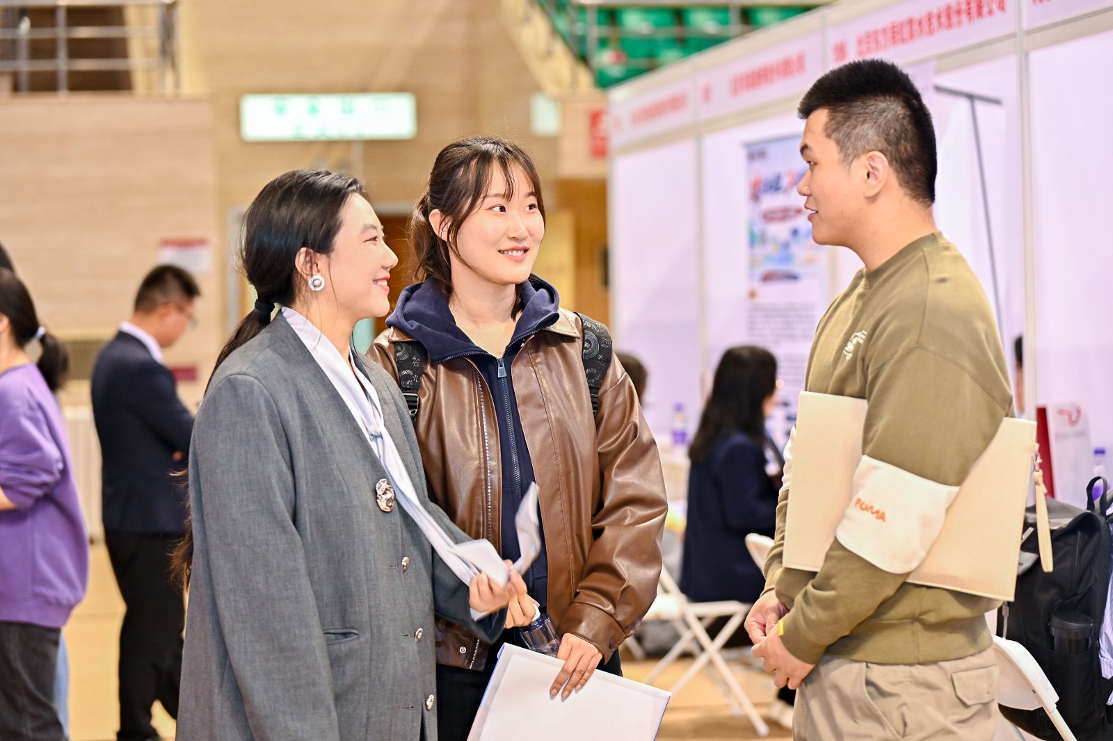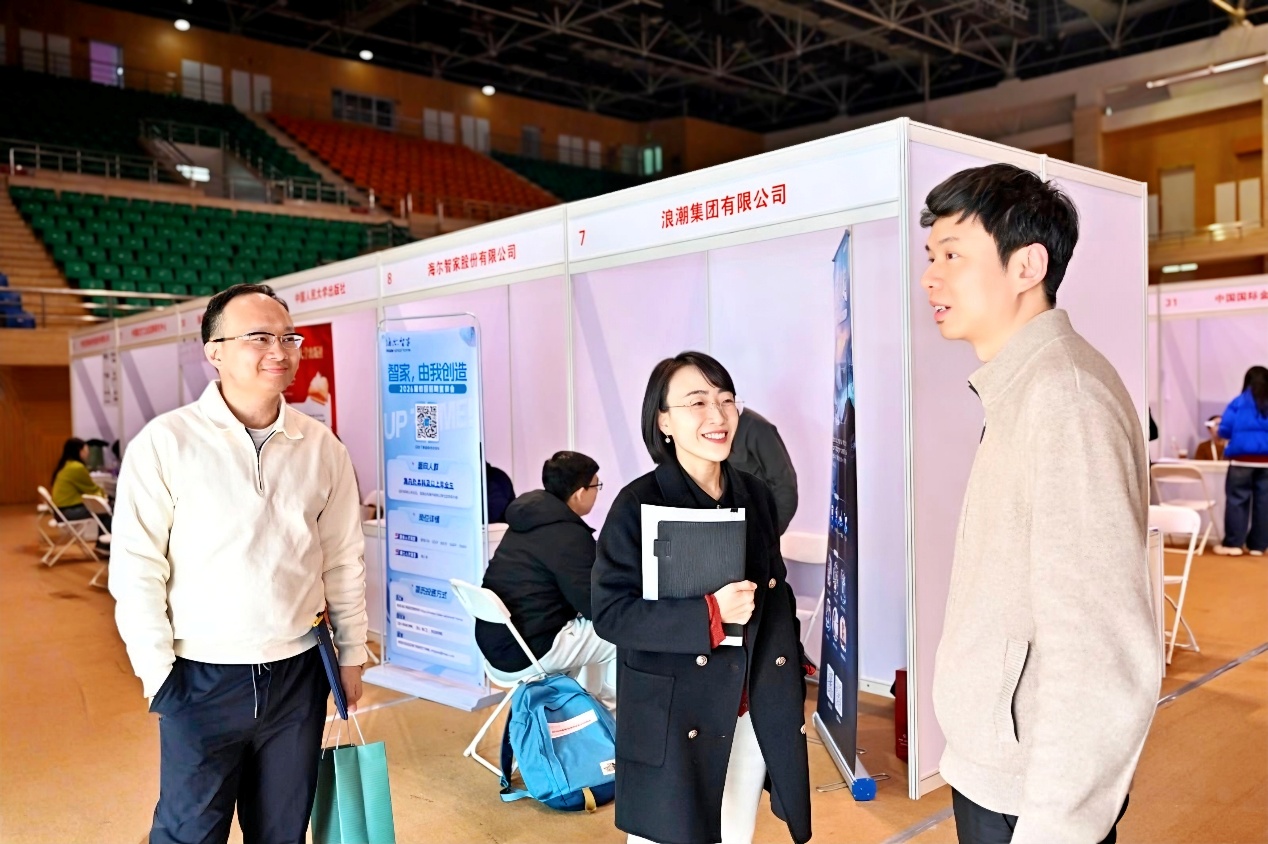 中国人民大学招生就业处处长丁莉婷、副处长布超,商学院院长易靖韬,党委副书记、纪委书记金添,到双选会现场与参会单位、求职学生交流。