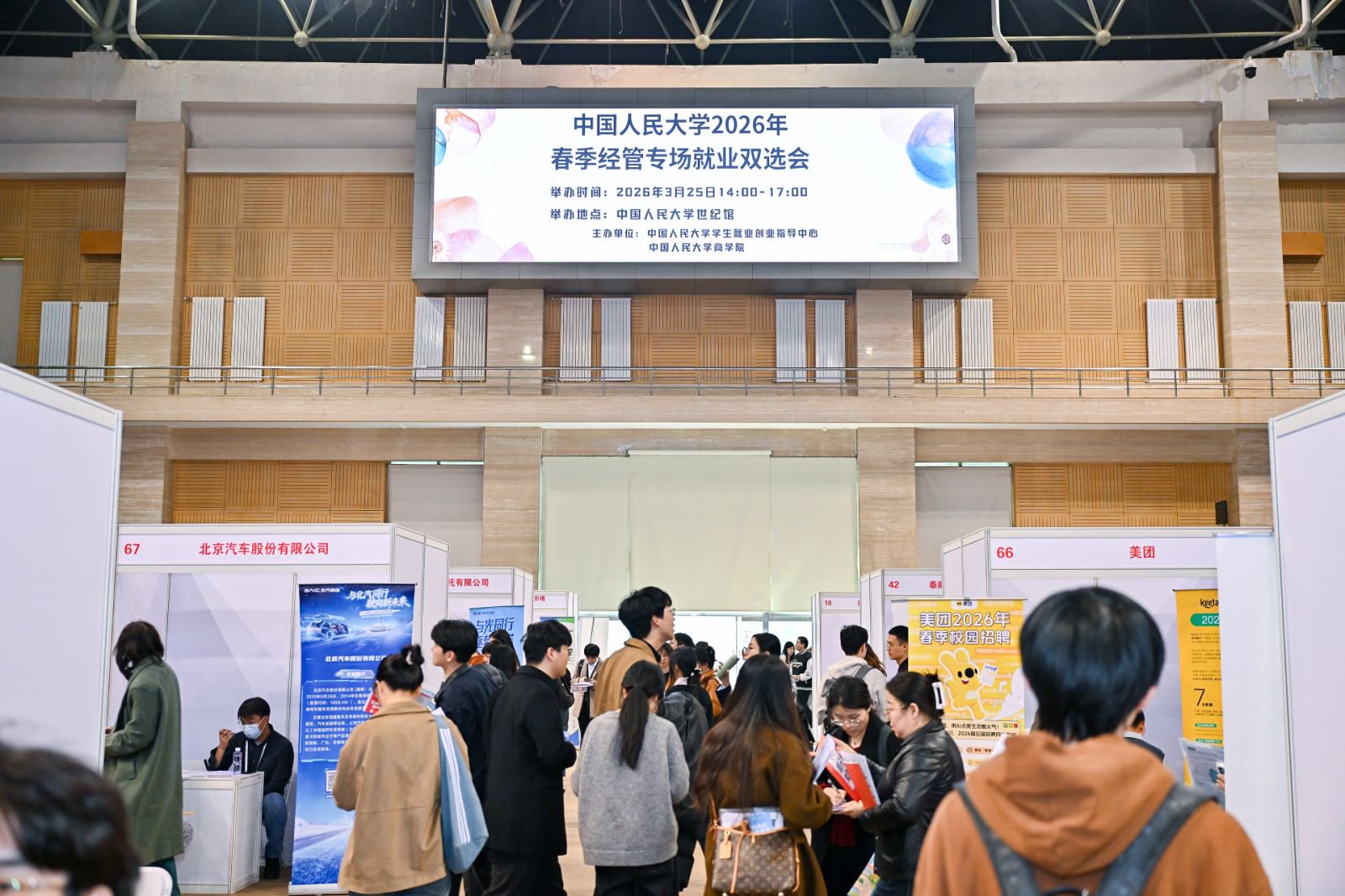 3月25日,由中国人民大学学生就业创业指导中心、中国人民大学商学院联合举办的中国人民大学2026年春季经管专场就业双选会在世纪馆主馆举行。本场双选会共邀请132家用人单位参会,招聘人数4200余人,吸引了1020位学生到场参会。