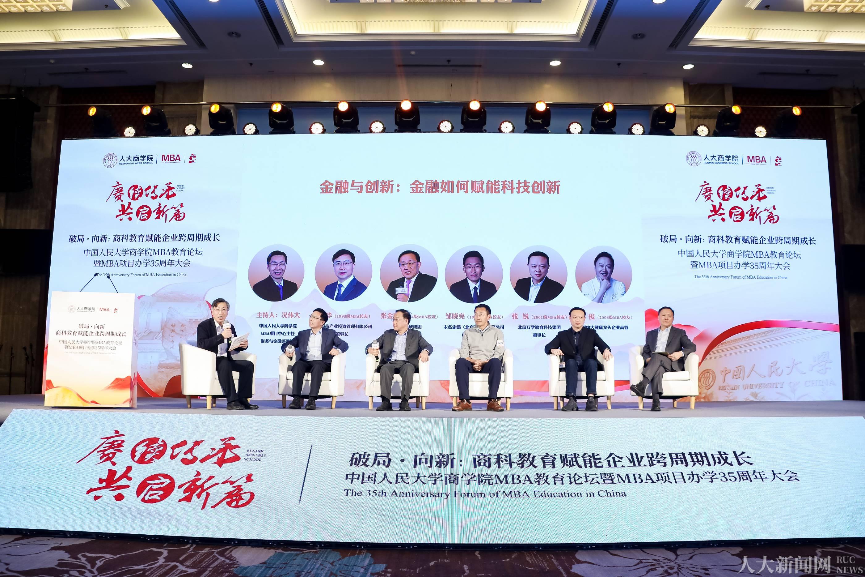 在“论道于商——峥嵘岁月谈”圆桌论坛,人大商学院MBA项目1993级校友孙华、1994级校友张金顺、1999级校友邹晓亮、2001级校友张锐、2006级校友卢俊围绕“金融如何赋能科技创新”主题展开讨论。况伟大主持。