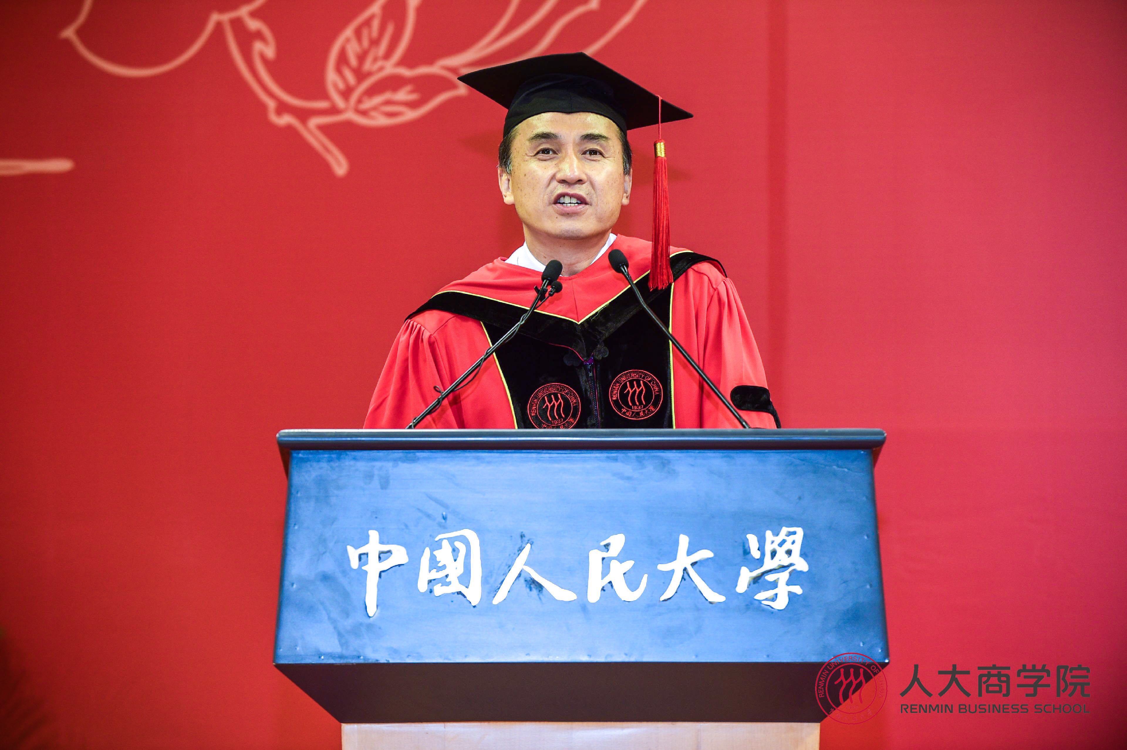 商学院会计系教授耿建新作为教师代表向全体毕业生寄语。他深情回忆了曾经观看过的表现大学生活的学生自编剧,希望毕业生在今后的人生中,都能常常想起在人大商学院的经历,不忘初心,不忘和导师、同学的情谊,并衷心希望学子们都愿意多回母校看看。