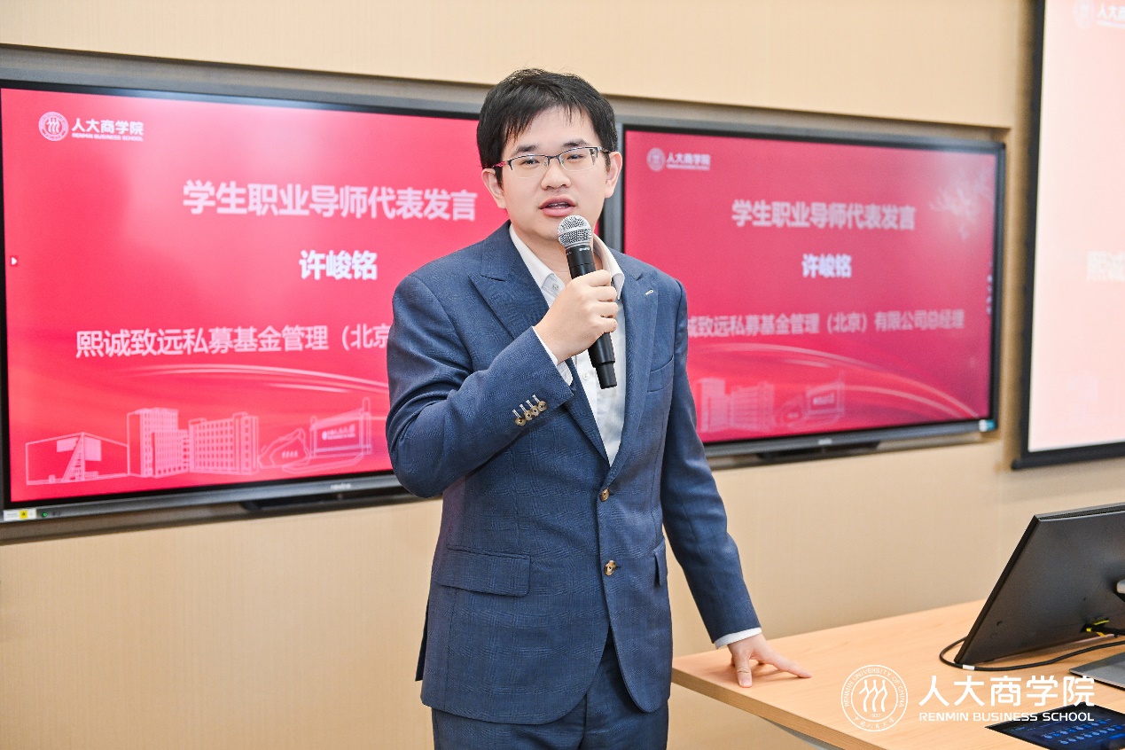 张皓代表中国人民大学招生就业处、中国人民大学学生就业创业指导中心对各位学生职业导师和青年校友志愿者表示欢迎和感谢,并介绍近年来学校学生就业创业情况。他强调了高校就业工作的时代意义,并对商学院整合社会与校友资源、创新就业育人机制的做法给予充分肯定。他表示,学校与学院将进一步多渠道用好校内外资源、拓展校企合作、深化生涯指导,共同构建更高质量的全链条就业服务体系。