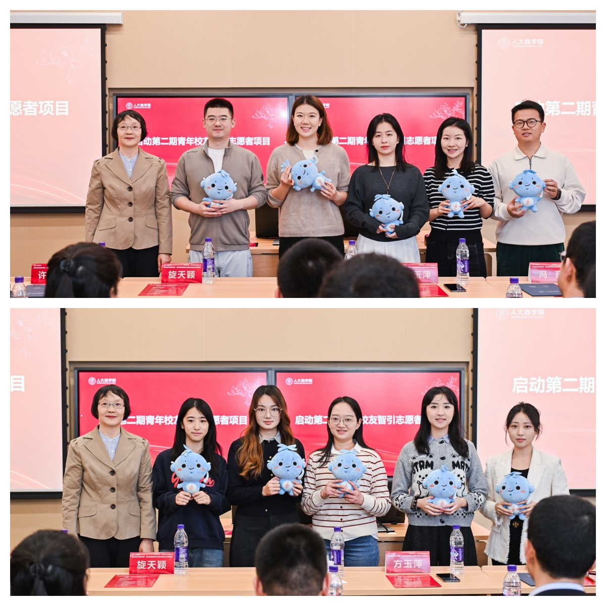 方玉萍为与会的青年校友志愿者赠送学院吉祥物,正式启动第二期青年校友智引志愿者项目。